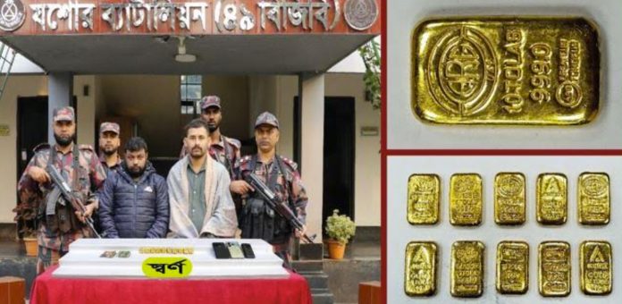 যশোরে দুই পাচারকারী আটক: প্যান্টের পকেটে মিলল ২ কোটি টাকার স্বর্ণ
