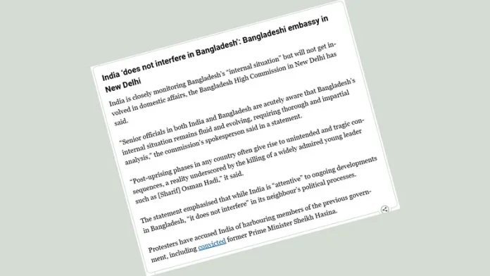 বাংলাদেশে চলমান অভ্যন্তরীণ পরিস্থিতি নিবিড়ভাবে পর্যবেক্ষণ করলেও প্রতিবেশী দেশটির রাজনৈতিক বা ঘরোয়া কোনো বিষয়ে ভারত কোনো প্রকার হস্তক্ষেপ করবে না বলে জানিয়েছে নয়াদিল্লিতে অবস্থিত বাংলাদেশ হাইকমিশন।